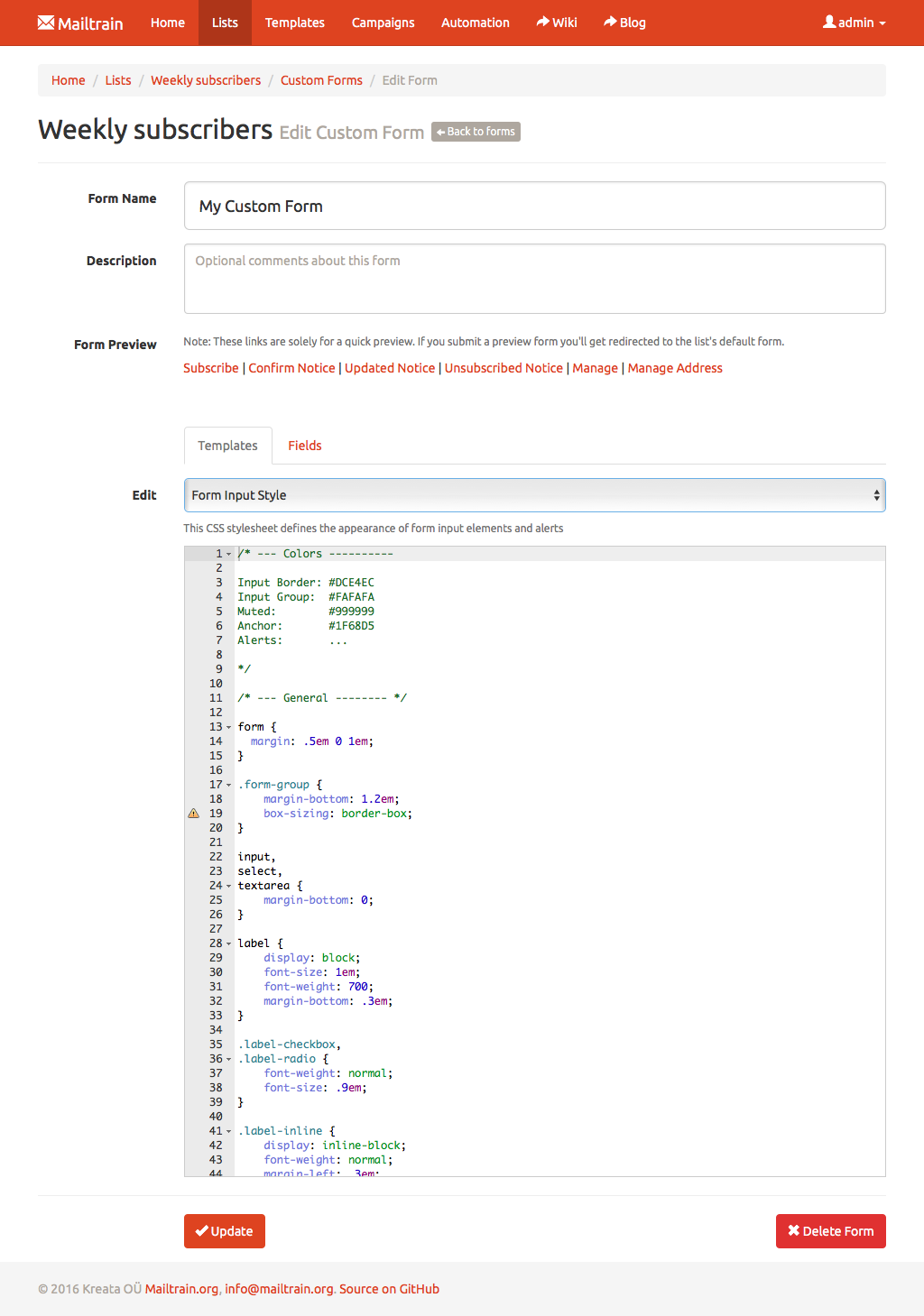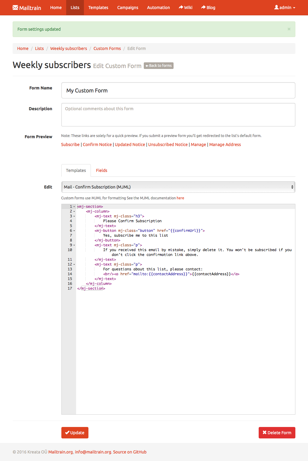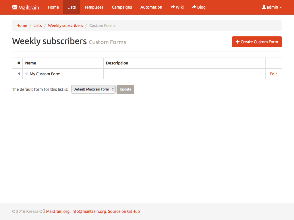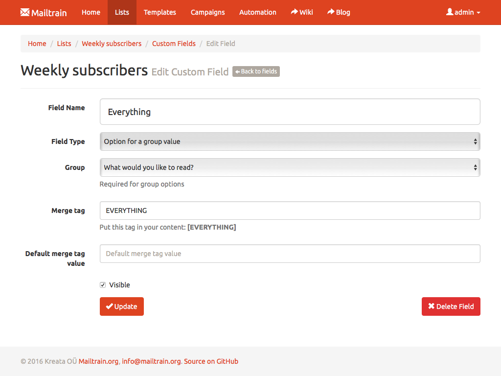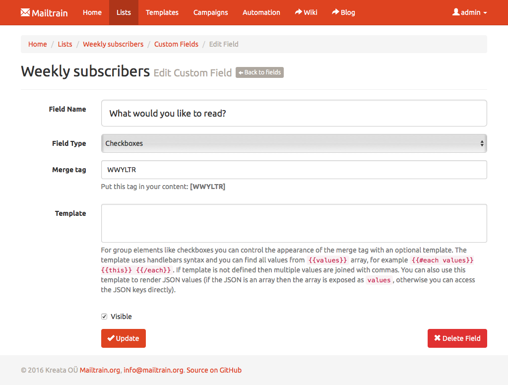 Text fields, numbers, drop downs or checkboxes, Mailtrain has them all. Every custom field can be included in the generated newsletters through merge tags. Mailtrain also supports custom forms.